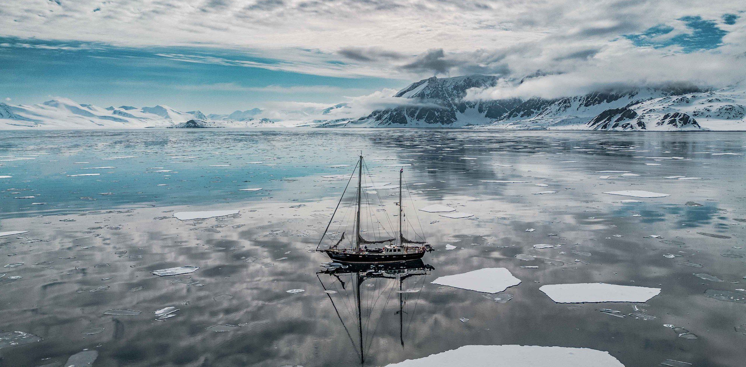 Expedition sailboat Tilvera resting agaisnt sea ice along Svalbard’s remote coastline